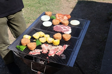 バーベキュー台の設置や火起こしなどをグループで協力しながら行いました。