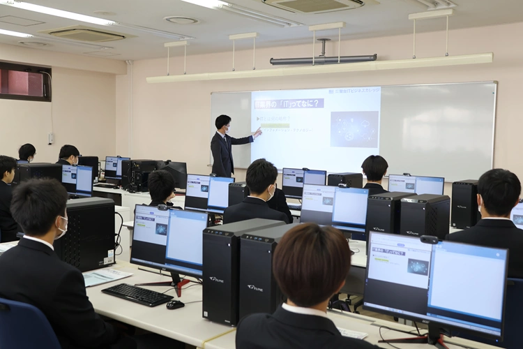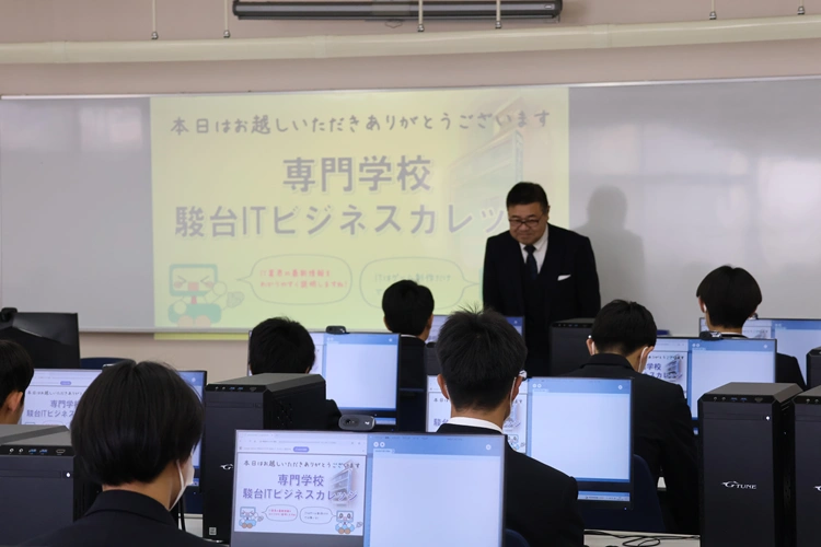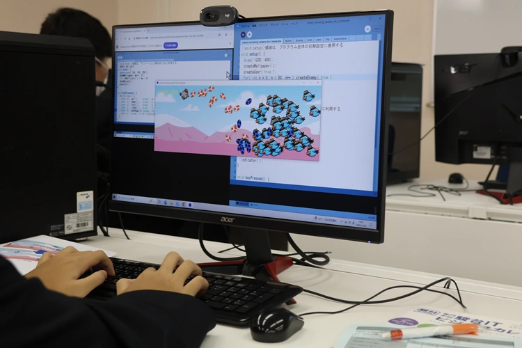当日は本校の教務課の先生が、学校紹介や IT・情報業界について説明を行い、説明後には SE プログラマ科の授業も担当されている本校講師によるプログラミングの体験授業として、ゲーム制作を行いました。